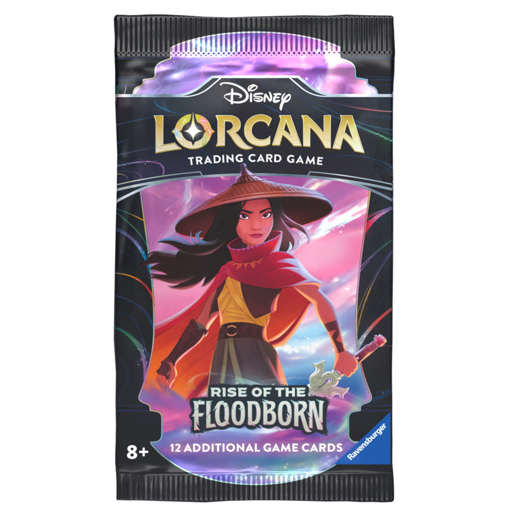 Booster packs contain twelve random cards from Disney Lorcana: Rise of the Floodborn. Use booster packs to build and customize your deck with abilities and characters beyond those found in starter decks.